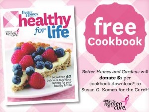 Go to Better Homes & Garden’s Facebook page, “Like” them and get a Better Homes & Garden Healthy For Life Free Cookbook (under the “Free Komen Cookbook” tab). Fill out the form & then download a free 32-page cookbook in pdf formatfilled with over 40 healthy, sweet and savory recipes. Plus, the great thing about this freebie is that for every cookbook downloaded, Better Homes and Gardens will donate $1.00 to Susan G. Komen for the Cure, awesome!
