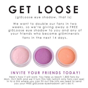 I am loving all these Facebook promotions that seem to keep popping up. GloMinerals wants to reach 1800 Fans by Monday 10/26, if they do, every fan will get a special link detailing how to get their free eyeshadow. Sweet! A girl can never have too much makeup! Become their Facebook fan HERE.