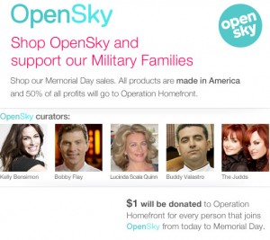 Here’s a neat offer from OpenSky. For every person that signs up between now and Memorial Day, OpenSky will donate $1.00 to Operation Homefront, a non-profit org that provides emergency financial assistance and other services to our military families. How great is that?! You can sign up for your free membership HERE and help out a great cause at the same time. Not familiar with OpenSky? It’s a social shopping network that featuring various celebrities, chefs & experts in Style, Home, Food and Health/Fitness who share their favorite products & special deals are offered daily. You select who you want to follow based on your interests. I’m following Bobby Flay, Mariel Hemingway, Alicia Silverstone & Project Nursery, among others. 🙂