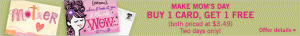 Hallmark has a nice promotion going on right now on their site HERE. Buy 1 Card for $3.49 and Get One Free. They even address it, stamp it and mail it to your recipient! “Offer valid beginning 12:00:01 a.m. (ET) on 4/15/10 through 11:59:01 p.m. (ET) on 4/16/10 only at Hallmark.com. Both card purchased and free card must be priced at $3.49 and in separate order line items to get offer. Limit one free card per person.”