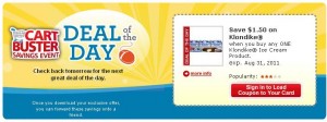 Dillons’ Cart Buster Event starts today. Head on over HERE & select your store to snag the “Deal of the Day” by clicking on the deal of the day icon. Today’s deal is an eCoupon for $1.50 off any one Klondike Ice Cream Product, sign in to load the coupon to your shopper’s card. The coupon will be available today only. but the coupon is valid through 8/31/11. Note: I had to log in and go back to the link again to download the coupon. The fine print:“Limited quantity while supplies last. One offer per household per day. Limit one use per digital coupon per transaction. The Cart Buster Deal of the Day” August 3rd and running through August 16th.**Check your local Kroger Co. Family of Stores for participating dates and deals. The Deal of the Day promotion is not valid at: Fred Meyer or Food 4 Less.”